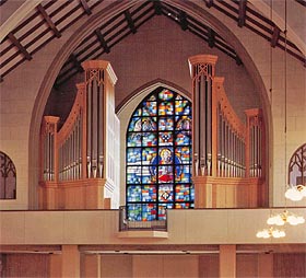 In einem II. Bauabschnitt wurden die 4 bis dahin bereits vorgesehenen und noch fehlenden Register eingebaut. Das Fenster mit der heiligen Caecilie ist -wie die Kirche- sehr bekannt in Nagoya und wird des Abends von innen angestrahlt. Es mußte frei bleiben, so wurde eine Lösung mit geteiltem Gehäuse gefunden, die dennoch eine mechanische Spieltraktur erlaubte. |