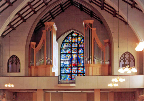 In einem II. Bauabschnitt wurden die 4 bis dahin bereits vorgesehenen und noch fehlenden Register eingebaut. Das Fenster mit der heiligen Caecilie ist -wie die Kirche- sehr bekannt in Nagoya und wird des Abends von innen angestrahlt. Es mußte frei bleiben, so wurde eine Lösung mit geteiltem Gehäuse gefunden, die dennoch eine mechanische Spieltraktur erlaubte. |