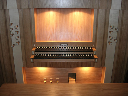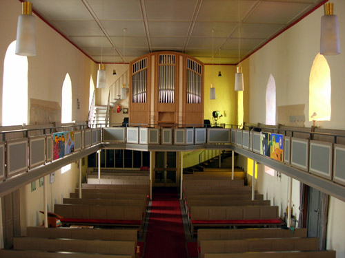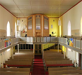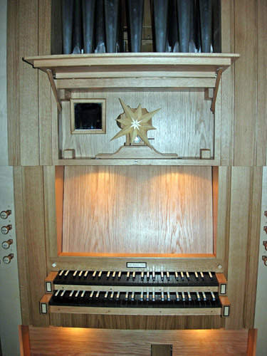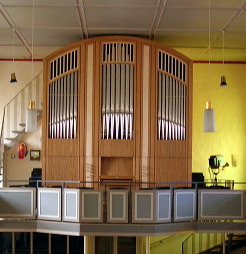 Gestaltung Mathias Weis. Die Register Gemshorn 4', Flauto amabile 8', Flageolett 2' und Octave 4' Ped. wurden in einem 2. Bauabschnitt hinzugefügt, der bereits Ende 2006 abgeschlossen werden konnte. |